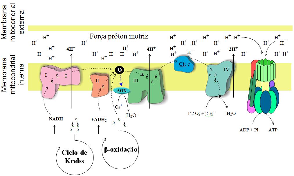 Os radicais livres estão intimamente relacionados à vida aeróbica na Terra, seja ela vegetal ou animal, tal fato decorre da natureza química do oxigênio que, embora seja um poderoso oxidante, é quase impossível evitar reações de oxidação secundária, ou seja, oxidações não relacionadas aos processos bioquímicos de obtenção de ATP (Sorg, 2004). Embora existam outras fontes celulares de geração de radicais livres tais como as cicloxigenases e peroxissomas a maior parte é gerada na mitocôndria (Lambeth, 2004; Balaban et al., 2005). Em vários pontos ao longo da cadeia de citocromos, elétrons derivados do NADH ou do FADH podem reagir diretamente com o oxigênio dando origem a espécies reativas de oxigênio (ERO´s). Assim, a respiração celular aeróbica forneceu um ganho energético incomparavelmente superior aos processos fermentativos, contudo, conduziu as células a um ambiente altamente oxidante. Por essa razão, as células desenvolveram uma poderosa maquinaria enzimática antioxidante. Essa revisão trata da discussão aprofundada dos elementos e processos envolvidos na fosforilação oxidativa com enfoque na geração de ERO´s fornecendo assim um ponto de vista não convencional dos processos mitocondriais de obtenção de energia. Apresenta a utilização do oxigênio como aceptor final de elétrons em organismos aeróbios como uma saída bem sucedida para o desenvolvimento de organismos mais complexos, mas que, inexoravelmente conduz esses organismos a um colapso lento e progressivo uma vez que expõem as células a um ambiente fortemente oxidativo.